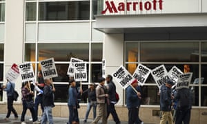 Striking hotel workers picket in front of a Marriott hotel in San Francisco earlier this month. Photograph: Ben Margot/AP