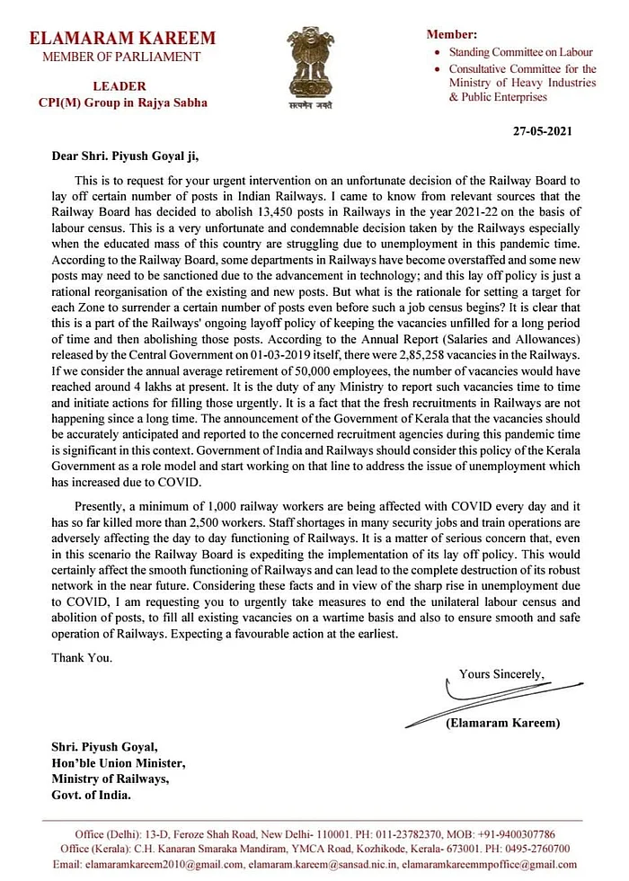 Opposing the plan to abolish over 13000 posts, the Communist Party of India (Marxist) leader Elamaram Kareem has urged the Railway Minister Piyush Goyal to stop the “labour census and abolition of posts”.